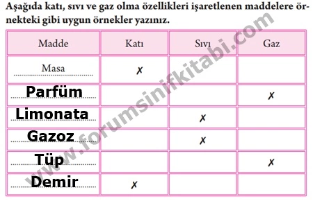 B. Aşağıda katı, sıvı ve gaz olma özellikleri işaretlenen maddelere örnekteki gibi uygun örnekler yazınız.