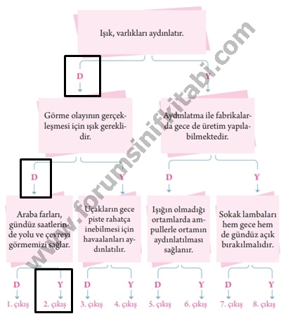 B. Aşağıda verilen ifadeler doğru ise “D”, yanlış ise “Y” okları takip edildiğinde kaçıncı çıkışa ulaşılır? İlgili çıkışı işaretleyiniz.