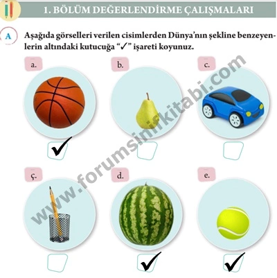 A. Aşağıda görselleri verilen cisimlerden Dünya’nın şekline benzeyenlerin altındaki kutucuğa “✓” işareti koyunuz.
