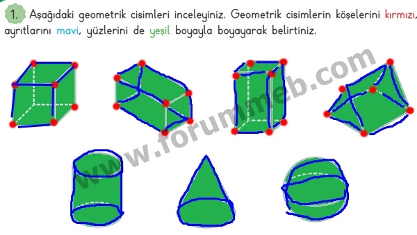 1. Aşağıdaki geometrik cisimleri inceleyiniz. Geometrik cisimlerin köşelerini kırmızı, ayrıtlarını mavi, yüzlerini de yeşil boyayla boyayarak belirtiniz.
