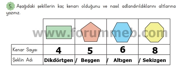 5. Aşağıdaki şekillerin kaç kenarı olduğunu ve nasıl adlandırıldıklarını altlarına yazınız.