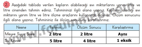 2. Aşağıdaki tabloda verilen kapların alabileceği sıvı miktarlarını yarım litre ve litre cinsinden tahmin ediniz. Tahmininizi ilgili alana yazınız. Kapların alacağı sıvı miktarını yarım litre ve litre ölçme araçlarını kullanarak ölçünüz. Ölçüm sonucunu ilgili alana yazınız. Tahmininiz ile ölçüm sonucunu karşılaştırınız.