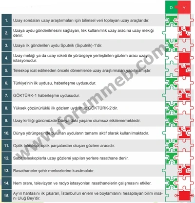 Soru : Aşağıdaki ifadelerin doğru mu, yanlış mı olduğuna karar vererek ilgili yapboz parçasını boyayınız.