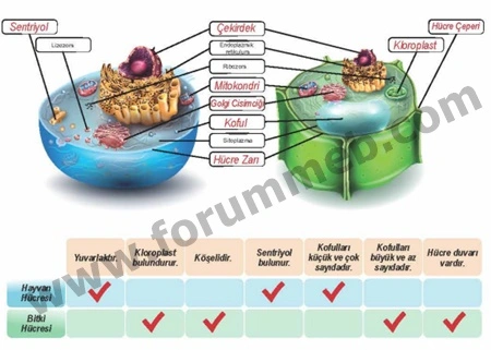 Soru : Aşağıdaki görselde verilen kutucuklara ilgili organellerin isimlerini yazınız. Görseli inceleyip aşağıdaki tabloda verilen özellikler ile hücre çeşidini eşleştirerek uygun kutucukları işaretleyiniz.