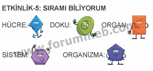 Soru : Aşağıdaki geometrik şekiller; hücre, doku, organ, sistem ve organizmayı temsil etmektedir. Geometrik şekillerin sayıları ile sözü edilen kavramların büyüklükleri orantılıdır. Kavramların temsil ettiği geometrik şekilleri noktalı yerlere çiziniz.
