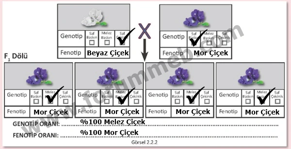 1. Verilen çaprazlamalara göre mor çiçek oluşmasını sağlayan gen baskın özelliktedir.