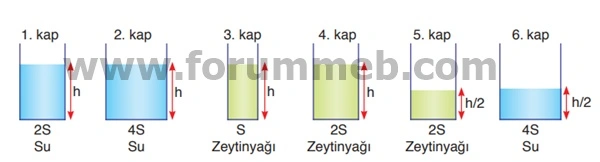 c) 3, 4 ve 5 numaralı kaplardaki sıvıların kabın tabanına yaptığı basınçları aşağıda verilen noktalı bölüme büyükten küçüğe doğru sıralayarak noktalı yerlere yazınız.
