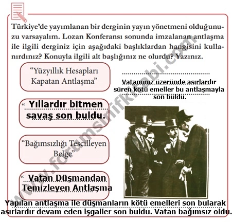 Soru : Türkiye’de yayımlanan bir derginin yayın yönetmeni olduğunuzu varsayalım. Lozan Konferansı sonunda imzalanan antlaşma ile ilgili derginiz için aşağıdaki başlıklardan hangisini kullanırdınız? Konuyla ilgili alt başlığınız ne olurdu? Yazınız.