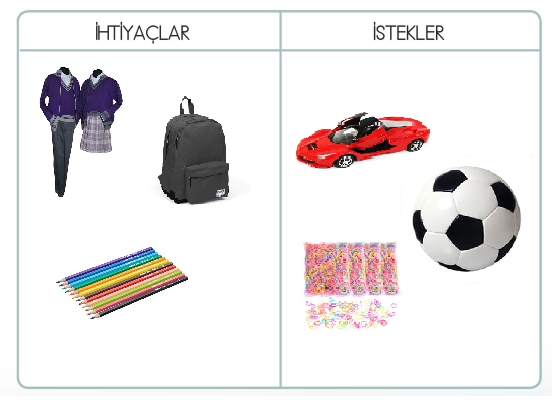 1 sınıf hayat bilgisi dersi bize öğrenmiş olduğumuz bu konuda ihtiyaçlarımız ve isteklerimiz arasındaki farklılıkları gözlemleyerek ve görseli inceleyerek ayırt edebilme özelliğine sahip olduk. Örneğin anne ve babamızla sohbet ettiğimiz zaman istek ve ihtiyaçlarımızın hangileri olduğunu hangilerini öncelik vermemiz gerektiğini hangilerini daha sonra alabileceğimizi öğrenerek ders çıkarabiliriz. Örneğin ihtiyaçlarımız elbette ki beslenme ,eğitim ,temizlik, barınma ve genel besinler su alışverişine ihtiyacı kemik temel kaynaklardan oluşmaktadır .Bir ayakkabımızın olması ihtiyacımızdır. Okul çantamızın olması bir ihtiyaçtır. Bu ihtiyaçları öncelik vermemiz gerekir.