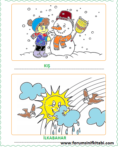Görsellerin hangi mevsimi yansıttığını belirleyerek altına yazınız. Görselleri, mevsimlerin özelliklerine uygun şekilde boyayınız