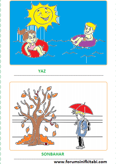 Cevap: İlkbahar mevsiminde çiçekler açmaya başlar havalar yavaş yavaş ısınır, yaz mevsimine gelindiğinde havalar iyice ısınır her taraf yemyeşil olur herkes denize girer. Sonbahar aylarında ağaçların yaprakları sararır, hava soğumaya başlar. Kış mevsiminde ise sararan yapraklar dökülür, hava çok soğuk olur kar yağar.