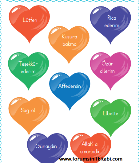 Soru: Aşağıdaki kalplerin içinde nezaket ifadeleri verilmiştir. Bunlarla ilgili birer cümle kurunuz.