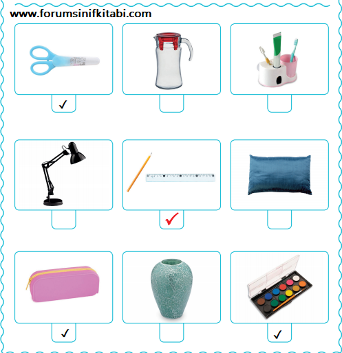 Soru: Aşağıdaki görselleri inceleyiniz. Derslerde kullanılan araç ve gereçleri belirleyerek örnekteki gibi işaretleyiniz.