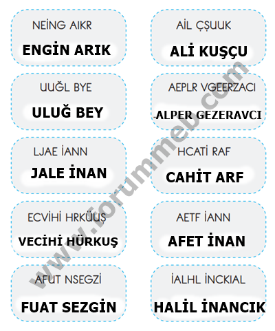 1. AÅŸağıda, Türk bilim insanlarının isimlerini oluÅŸturan harfler karışık olarak verilmiÅŸtir. İpuçlarından faydalanarak noktalı alanlara Türk bilim insanlarının isimlerini yazalım. Bu bilim insanlarımızın ülkemizin geliÅŸimine katkılarını söyleyelim.Â