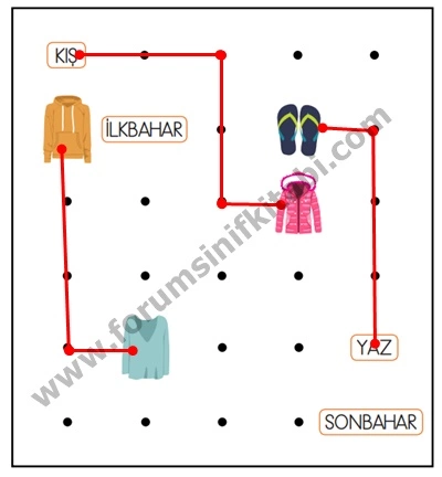 Soru : Aşağıdaki bulmacada bazı kıyafetler ve mevsim adları verilmiştir. Bu kıyafetleri, giyildikleri mevsimle noktaları birleştirerek eşleştiriniz.