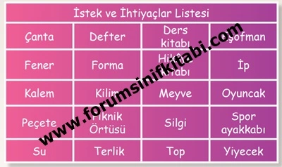 İhtiyaçlarım : Çanta, silgi, defter ve kalem