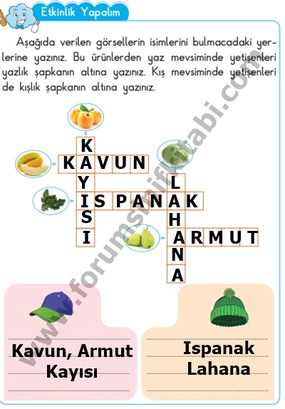 Soru : Aşağıda verilen görsellerin isimlerini bulmacadaki yerlerine yazınız. Bu ürünlerden yaz mevsiminde yetişenleri yazlık şapkanın altına yazınız. Kış mevsiminde yetişenleri de kışlık şapkanın altına yazınız.