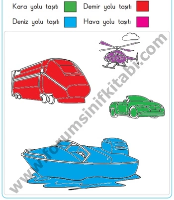 Soru : Aşağıdaki taşıt resimlerini, hareket ettikleri ulaşım yolunun yanında belirtilen renge boyayınız.