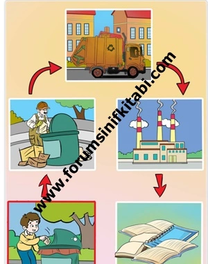 Resimde çocuk çöpe çöp atmaktadır. Daha sonra görevli onu ayrıştırmaktadır. Daha sonra ise çöp arabası çöpleri fabrikaya götürmektedir. Daha sonra ise fabrikada defterler ve kitaplar geri dönüştürülmektedir.