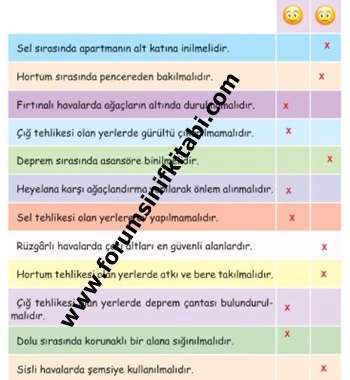 Soru : Doğa olaylarına ve doğal afetlere karşı alınacak önlemler ile ilgili verilen ifadeler doğru ise :), yanlış ise 🙁 sütununu işaretleyiniz.