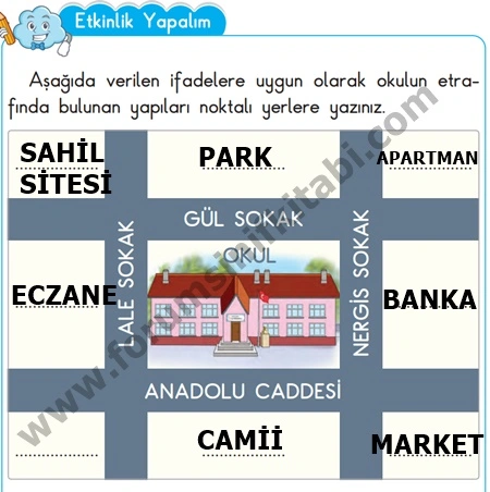 Soru : Aşağıda verilen ifadelere uygun olarak okulun etrafında bulunan yapıları noktalı yerlere yazınız.