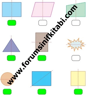 1) Noktalı yerlerden katlandığında simetrik olan şekillerin altlarındaki kutuyu yeşile boyayınız.