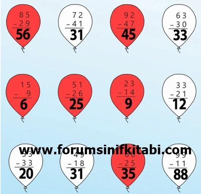1) Aşağıdaki çıkarma işlemlerini yapınız. Onluk bozmayı gerektiren çıkarma işlemlerinin bulunduğu balonları kırmızıya boyayınız.