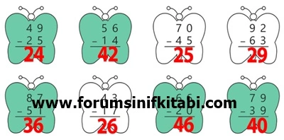 2) Aşağıdaki çıkarma işlemlerini yapınız. Onluk bozmayı gerektirmeyen çıkarma işlemlerinin bulunduğu kelebekleri yeşile boyayınız.