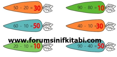 2) Aşağıdaki çıkarma işlemlerini zihinden yapınız. Sonucu aynı olan havuçları aynı renge boyayınız.