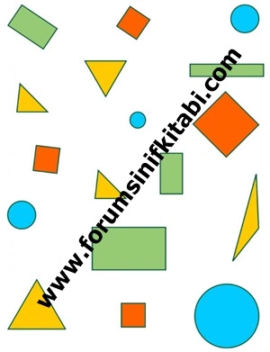 3) Aşağıda farklı yön ve büyüklüklerde geometrik şekiller verilmiştir. Aynı geometrik özelliklere sahip şekilleri aynı renge boyayınız.