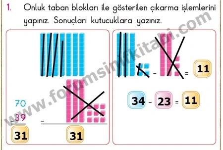 1. Onluk taban blokları ile gösterilen çıkarma işlemlerini yapınız. Sonuçları kutucuklara yazınız.