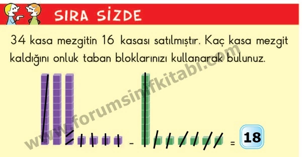 Soru : 34 kasa mezgittin 16 kasası satılmıştır. Kaç kasa mezgit kaldığını onluk taban bloklarınız kullanarak bulunuz.