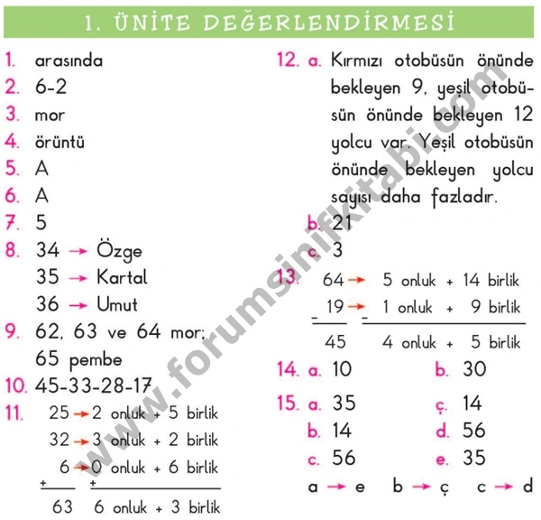 2. Sınıf Matematik Kitabı 1. Ünite Değerlendirmesi Metni Cevapları