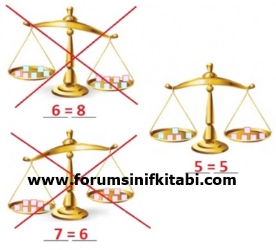 Soru : AÅŸağıda bir terazi ve birim küpler verilmiÅŸtir. Öğrenciler bunlarla çalışmalar yapmışlardır. Çalışmalara ait matematik cümlesini örnekteki gibi “eÅŸittir” “=” iÅŸareti ile tamamlayalım. EÅŸit olmayan terazilerin üstünü çizelim.