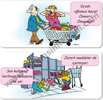 Karikatürlerde alışveriş yaparken sınırı kaçırmanın ve bilinçli tüketici olmanın örnekleri verilmiştir.