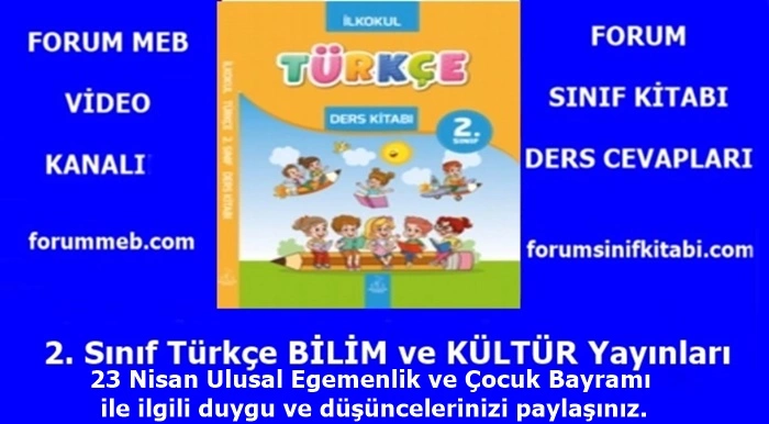 2. Sınıf Türkçe Kitabı 23 Nisan Ulusal Egemenlik ve Çocuk Bayramı ile ilgili duygu ve düşüncelerinizi arkadaşlarınızla paylaşınız. konusunu kısaca ele alacağız.