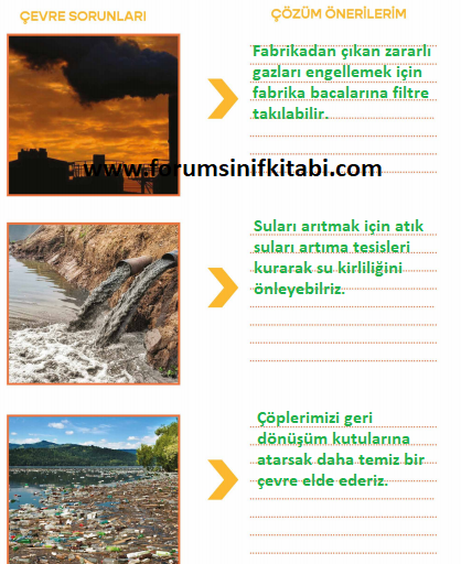Soru: Aşağıdaki görsellerde yer alan çevre sorunlarının çözümüne yönelik önerilerinizi noktalı yerlere yazınız.