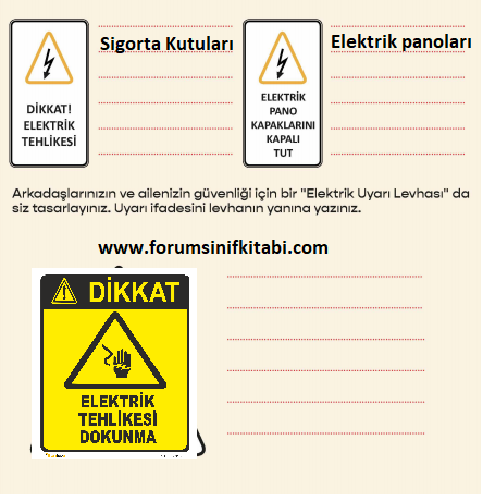 Arkadaşlarınızın ve ailenizin güvenliği için bir “Elektrik Uyarı Levhası” da siz tasarlayınız. Uyarı ifadesini levhanın yanına yazınız.