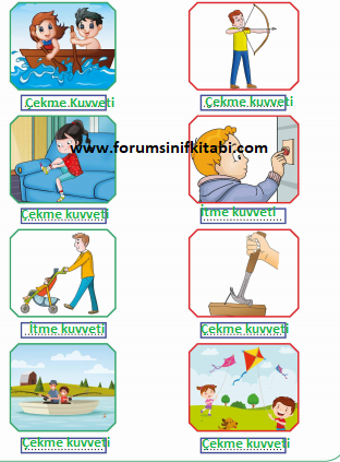 Soru: Aşağıdaki görsellerde varlıklara uygulanan itme veya çekme kuvvetlerini belirleyerek görsellerin altındaki kutucuklara yazınız.