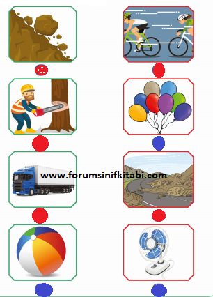 Soru: Aşağıdaki cisimler hareketli iken durdurmaya çalıştığımızda tehlikeli olabileceklerin altındaki kutuyu kırmızıya, tehlikeli olmayacakların altındaki kutuyu maviye boyayınız.
