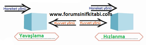 Soru: Aşağıda bazı cisimlerin hareket yönleri ile cisimlere sonradan uygulanan kuvvetlerin yönleri gösterilmiştir. Hareket ve kuvvet yönlerini dikkate alarak cisimlerde gözlenecek hareket değişikliklerini (hızlanma / yavaşlama) cisimlerin altındaki kutucuklara yazınız.