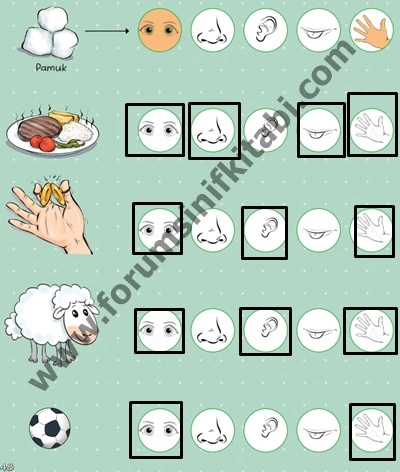 Soru : Aşağıdaki varlıkları ayırt edebilmek için kullanabileceğimiz duyu organlarını boyayınız. Bir örnek sizin için yapılmıştır.