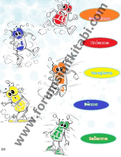 Soru : Aşağıda Karbon’un hareketleri verilmiştir. Hareketleri doğru ifadeler ile eşleştiriniz. Doğru hareket ile robotu aynı renge boyayınız.