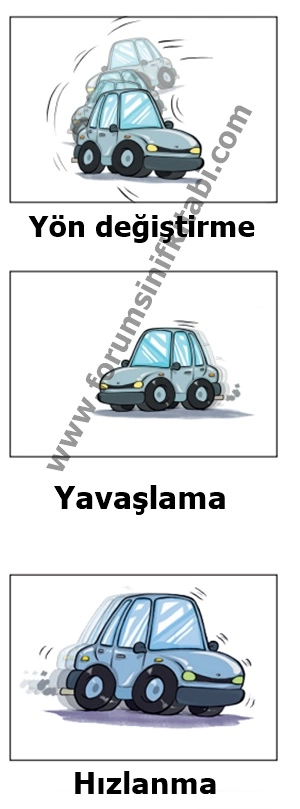 1. Yukarıda verilen görsele baktığımız zaman bir arabanın çeşitli birçok hareketi yol açtığını görebilmekteyiz bir arabanın sabit bir şekilde durduğu zaman hareket etmesi yavaşlaması hızlanması yön değiştirmesi çeşitli birçok hareketi ortaya çıkarmaktadır arabanın farklı birçok hareketini çevremizde gözlemleyebiliriz. Çevremizde görmüş olduğunuz sabit bir şekilde duran araçların yavaş bir şekilde hızlanması ışıklarda geldiği zaman durması ve yol boyunca hızlanması yol bittiği zaman ise yavaşlayarak park etmesi farklı birçok hareket özelliğine örnek olarak verilebilmektedir.