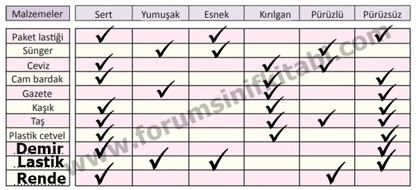 ● Aşağıdaki tabloya malzemelerin özelliklerini işaretleyelim. (Bir madde birden fazla özelliğe sahip olabilir.)