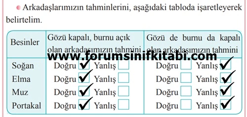 Sınıfımızda istekli olan iki arkadaşımızı kaldırıp ikisinin de gözlerini bağlayalım. Gözleri bağlanan arkadaşlarımızdan birisi burnunu kapatsın, diğeri ise kapatmasın. Hazırladığımız yiyeceklerden eşit büyüklükte birer örnek kesip tabağa koyalım. Arkadaşlarımıza kestiğimiz bu yiyecekleri sırasıyla tattıralım. Arkadaşlarımıza, tattıklarının hangi yiyecek olduğunu soralım.