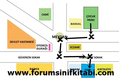 Soru : Evinizden okula geldiğiniz yolun krokisini defterinize çiziniz. Yol boyunca yön değiştirdiğiniz yerleri belirleyerek “X” ile işaretleyiniz.
