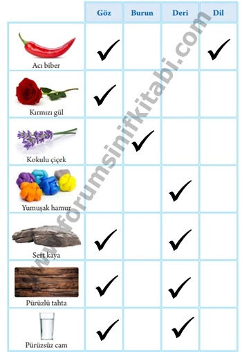 B. Aşağıdaki tabloda bazı maddeler, sahip oldukları özelliklerle verilmiştir. Bu maddelere ait özellikleri hangi duyu organlarımızla algıladığımızı belirleyerek tablodaki ilgili kutucukları işaretleyelim (Aynı madde için birden fazla kutucuk işaretlenebilir.).