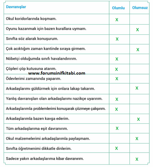Soru: Aşağıdaki tabloda verilen davranışları inceleyiniz. Davranışların olumlu mu, olumsuz mu olduğunu ” ” işareti ile işaretleyiniz.