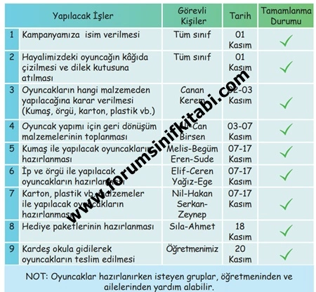 3 sınıf hayat bilgisi ders kitabında yer alan bu ödevimizde birlikte yardımlaşarak ve dayanışma içerisinde oyuncakların toplanması oyuncakların yapılması oyuncakları bombasıyla birçok çocuğa bu oyuncakların gönderilmesi ve çocukların sevindirilmesi temel esas alınmış bir yardımlaşma iyilik örneği olarak gösterilmektedir. Toplamış olduğumuz oyuncakları ihtiyaç sahibi çocuklara ve bu oyuncakla değerlendirecek kişilere ulaştırdığımız zaman hem çocukların oynayabileceği bir alan hem de zaman geçirebileceği oyuncaklarla sevindirmek bizleri çok mutlu etmektedir. Arkadaşlarımızla beraber yapmış olduğumuz etkinlikte iyilik gibi önemli bir ahlakı edinmiş olduk. İyilik sayesinde yardımlaşmaya dayanışma kapıları açılmıştır.